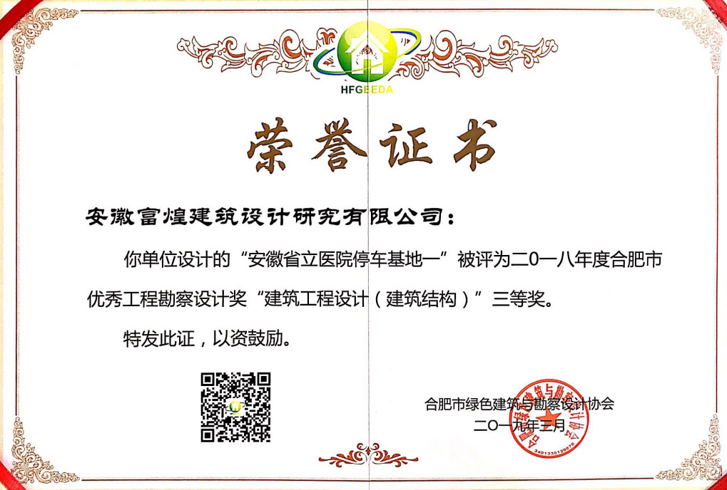 二〇一八年度合肥市优异工程勘探设计奖修建工程设计(修建结构)三等奖”